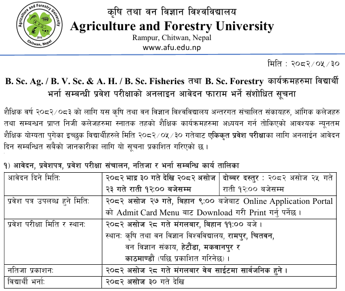 Agriculture and Forestry University (AFU) has opened the form fill-up notice for the common entrance examination (AFU CEE) of Bachelor of Science in Agriculture , Veterinary Science and Animal Husbandry (BVSc. & A. H.), BSc. Fisheries and BSc. Forestry for the academic year 2082/2083.